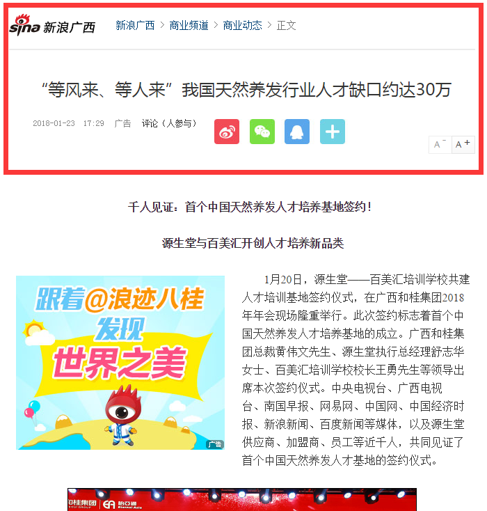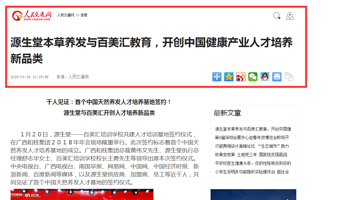 1月20日,源生堂與百美匯培訓(xùn)學(xué)校共建人才培訓(xùn)基地簽約儀式,在廣西和桂集團(tuán)2018年年會(huì)現(xiàn)場(chǎng)隆重舉行。此次簽約標(biāo)志著首個(gè)中國(guó)天然養(yǎng)發(fā)人才培養(yǎng)基地的成立。廣西和桂集團(tuán)總裁黃偉文先生、源生堂執(zhí)行總經(jīng)理舒志華女士、百美匯培訓(xùn)學(xué)校校長(zhǎng)王勇先生等領(lǐng)導(dǎo)出席本次簽約儀式。中央電視臺(tái)、廣西電視臺(tái)、南國(guó)早報(bào)、網(wǎng)易網(wǎng)、中國(guó)網(wǎng)、中國(guó)經(jīng)濟(jì)時(shí)報(bào)、新浪新聞、百度新聞等媒體,以及源生堂供應(yīng)商、加盟商、員工等近千人,共同見(jiàn)證了首個(gè)中國(guó)天然養(yǎng)發(fā)人才基地的簽約儀式。